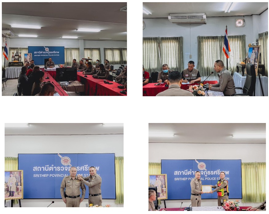พ.ต.อ.นิคม ศรเหล็ก ผกก.สภ.ศรีเทพ เป็นประธานการประชุมบริหารประจำเดือน ณ ห้องประชุมชั้น 2 สภ.ศรีเทพ โดยมี รอง ผกก., สว. และข้าราชการตำรวจในสังกัด ได้มอบนโยบายและข้อสั่งการในการปฏิบัติงานให้แก่ข้าราชการตำรวจในสังกัด พร้อมทั้งได้ประดับยศ และแสดงความยินดีให้กับ ร.ต.อ.สฤษดิ์ ปิ่นนาค ได้เลื่อนยศจาก “ ร้อยตำรวจโท“ ขึ้นเป็น “ร้อยตำรวจเอก” และมอบใบประกาศนียบัตร”สุภาพบุรุษจราจร“จากสำนักงานตำรวจแห่งชาติ ให้แก่ ด.ต.สมพล ษมาชัยปฏิการ ผบ.หมู่ (จร.) สภ.ศรีเทพ